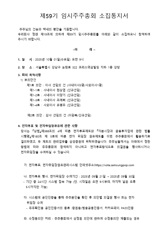 제 59기 임시주주총회 소집통지서(10월 24일)